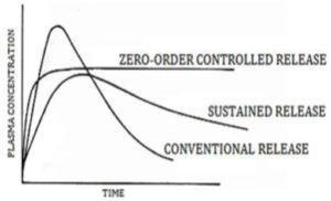 Plasma drug concentration-profiles for conventional tablet or capsule formulation, a sustained release formulation, and a zero-order sustained release formulation are as follow in given Fig. 1.