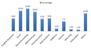 RESULTS: Out of 520 patients, 88 patients (16.92%) were admitted at the emergency department with the complaints of nausea and vomiting followed by fever (15.19%) as shown in Fig. 1.