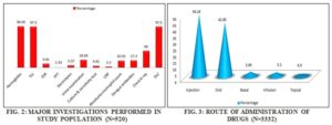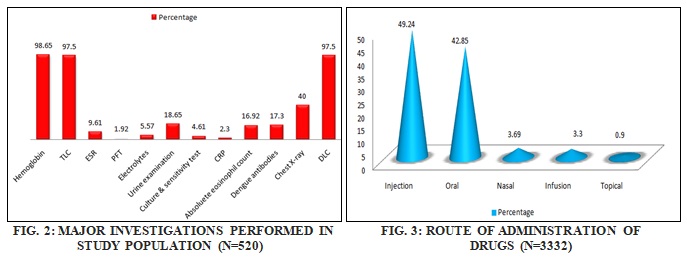 Haemoglobin (98.65%), total leucocytes count (97.5%) and differential leucocytes count (97.5%) were the most common investigations performed in the study population which is depicted in Fig. 2. As shown in Fig. 3, drugs were prescribed in five different dosage forms in the study population. Out of total 3332 drugs, majority of drugs were given through injection form (49.24%) followed by oral route (42.85%). Similar trend was observed in reports from Pandey K et al. 9 Fig. 4 showed that the main drugs prescribed were anti-emetics which constituted 24.75% of the total, followed by antibiotics (24.42%) and anti-ulcer agents (23.85%). Thus, the most commonly prescribed drug includes anti-emetics (24.75%). Similar results were obtained by the study conducted by Pandey K et al., 9 and Barot et al. 8