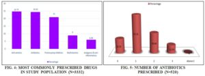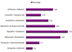 The number of encounters with antibiotics was 410 (78.84%). A single antibiotic was prescribed in 235 (57.31%) and two antibiotics were found in 125 (30.48%) prescriptions as shown in Fig. 5. The main reason for such an empirical use of antibiotics within 24 h of admission is either over estimation of the severity of illness. They are also under pressure from patients attendants, who believe that the prophylactic antibiotic use provides rapid relief of disease 9, 10. Out of 3332 drugs prescribed, 17.02% prescribed drugs were given as fixed dose combinations. The most commonly prescribed fixed dose combinations were piperacillin and tazobactum (3.75%) and rabeprazole and domperidone (3.09%) which is illustrated in Fig. 6.