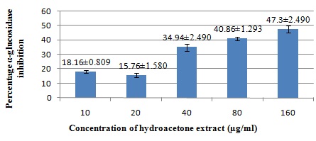 α-Glucosidase Inhibitory Activity: An increase in blood glucose has been linked to diabetes and its complications, which give a pointer to control of postprandial glucose. But, inhibition of carbohydrate-hydrolyzing enzymes (α-glucosidase) would slow down the absorption of glucose, reduce plasma glucose level, and consequently decrease postprandial hyperglycemia 22, 23. The percentage α-glucosidase inhibitory activity was found to be 18.16 ± 0.809, 15.76 ± 1.580, 34.94 ± 2.490, 40.86 ± 1.293, and 47.30 ± 2.490 at concentrations 10µg/ml, 20 µg/ml, 40 µg/ml, 80 µg/ml and 160 µg/ml Fig. 1. With an increase in concentration, there was an increase in percentage inhibition. Lowest percentage inhibition was 15.76 at 20 µg/ml. At 20 µg/ml, the difference is 3 %, which could be because the difference of 0.01 OD leads to a 7% difference in α-glucosidase inhibition due to an instrumental error. The IC50 value for α-glucosidase inhibitory activity of clove was found to be 154.36 µg/ml, which showed that clove displays a strong inhibition on enzyme α-glucosidase at the studied concentrations, thereby showing antidiabetic activity. An earlier study has shown that the α-glucosidase inhibitory activity of clove in solvents like methanol, dichloromethane and n-hexane and the IC50 value was found to be 0.3 ± 0.3 µg/ml, 0.8 ± 0.4 µg/ml and 1.1 µg/ml 24.