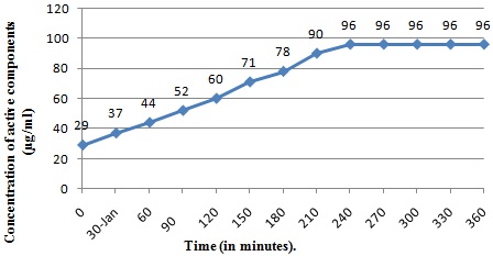 Release Efficiency: Released efficiency of the microencapsulated extract was determined using a UV visible spectrophotometer over a period of 6 h. From 0 h to 3 ½ h, there was an increase in absorbance. However, from 4 h onwards, there was no increase observed and the absorbance remained constant Fig. 3. A plot of concentration (µg/ml) vs time (in h) was plotted. It was seen that with an increase in time, there was an increase in concentration.
