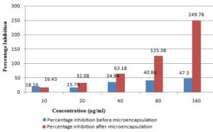 The percentage α-glucosidase inhibition of extract post microencapsulation (16.43) was less than that of before micro-encapsulation (18.16) at concentration 10 µg/ml. This can be due to the presence of fibers in the hydroacetone extract of Syzygium aromaticum. At concentrations 80 µg/ml and 160 µg/ml post microencapsulation, the percentage α-glucosidase inhibition was 125.38 and 249.78, respectively. As these values are more than 100, they cannot be considered. At 20 µg/ml and 40 µg/ml, the percentage α-glucosidase inhibition observed was 32.08 and 63.18, respectively. Hence, microencapsulated plant extract when incorporated into antidiabetic medications will show better inhibition.