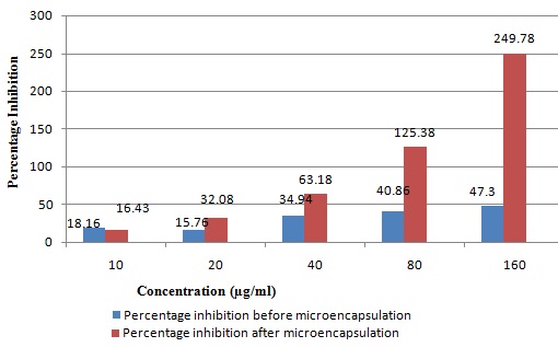 The percentage α-glucosidase inhibitions of hydroacetone extract before microencapsulation and after microencapsulation were compared using comparative graphs Fig. 4. The percentage α-glucosidase inhibition of extract before micro-encapsulation were 18.16, 15.76, 34.94, 40.86 and 47.80 for concentrations 10 µg/ml, 20 µg/ml, 40µg/ml, 80 µg/ml and 160 µg/ml. The percentage α-glucosidase inhibition of extract after micro-encapsulation were found to be 16.43, 32.08, 63.18, 125.38 and 249.78 respectively. It was found that microencapsulated extract showed more percentage of α-glucosidase inhibition in comparison to hydroacetone extract.