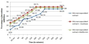There was a plateau formation. The enhancement between the highest and lowest concentration studied was 150.71%. The IC50 value of microencapsulated spice extract with Metformin was 72.28 µg/ml. The α-glucosidase inhibitory activity of micro-encapsulated spice extract along with Acarbose showed an increase in percentage α-glucosidase inhibition values. From 0 h to 2 ½ h there was an increase in the percentage α-glucosidase inhibition, however, from 3 h, there was no increase seen in percentage α-glucosidase inhibition, and it remained constant at 59.71 %. The IC50 value was 76.71%. This also resulted in the formation of a plateau. Formation of a plateau indicated that release had achieved a constant rate. Hence, there was some herb-drug interaction involved.