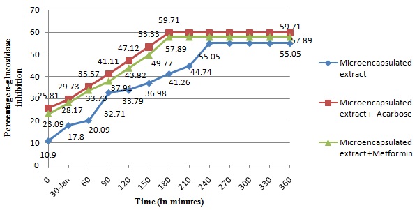 Release Efficiency of Herb and Drug: Herb-drug interaction involving the α-glucosidase inhibitory activity of microencapsulated spice extract along with Acarbose and α-glucosidase inhibitory activity of microencapsulated spice extract along with Metformin was studied. In the case of α-glucosidase inhibitory activity of micro-encapsulated extract with Metformin, there was an increase in the values of percentage α-glucosidase inhibition concerning time, from 0 h to 2 ½ h. However, from 3 h there was no increase in the percentage α-glucosidase inhibition, and it remained constant at 57.89%.